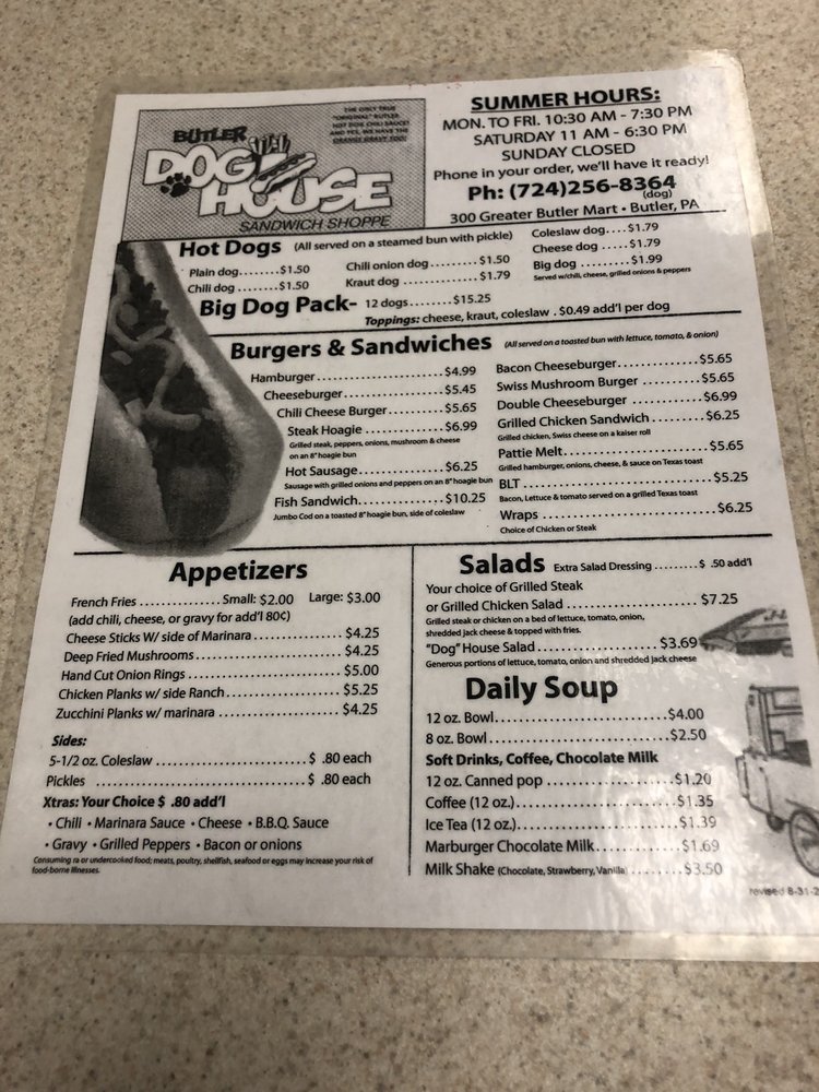 Welcome to Butler Dog House, a charming spot located in Butler, PA. Specializing in hot dogs and sandwiches, this eatery offers a casual dining experience perfect for families and groups alike. The menu highlights include their flavorful hot dogs and memorable cheeseburgers, with customer favorites like the chili dog and generous orders of fries.